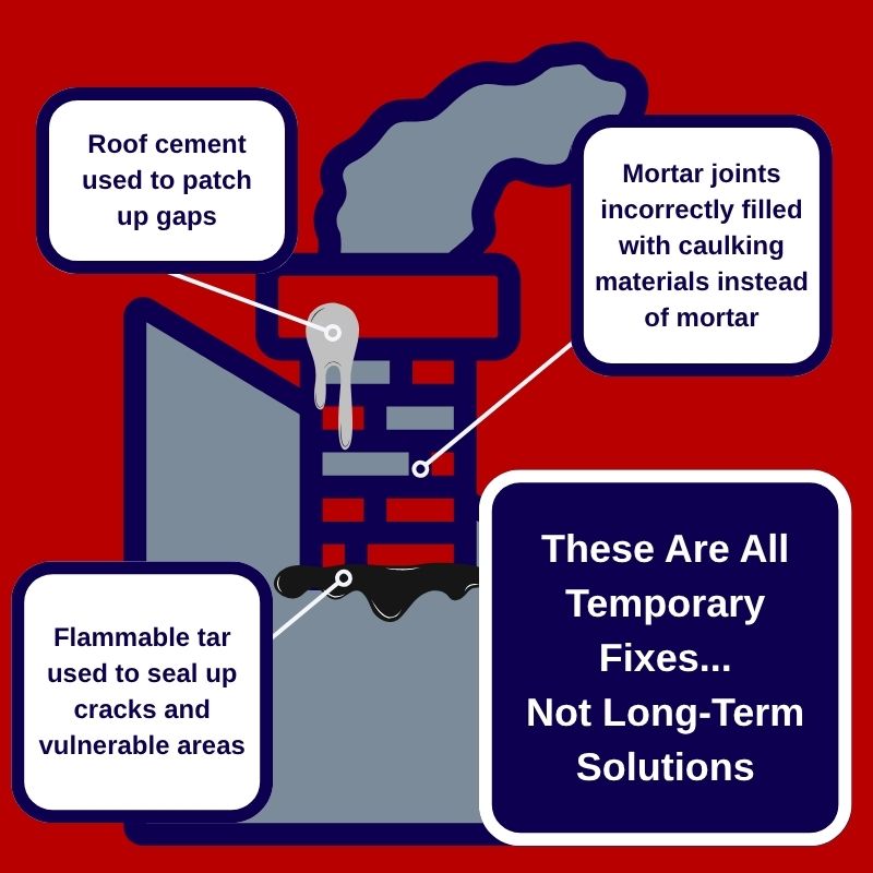 What happens is that we come out to provide a free consultation to discover a chimney system covered in layers of temporary patches with materials like caulk, roof cement, and similar quick-fix options. Some of these are even flammable, like tar…and none of them are appropriate for long-term chimney repair. In many cases, instead of properly repointing brick with mortar, companies have simply squeezed caulk into the joints, or they’ve used tar to patch up cracks and gaps.